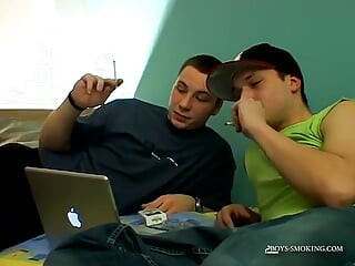 Sepupu gay merokok di sofa dan berciuman, dia mengisap kontol pria gay ini dan putingnya yang berair