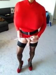 Corseted big fake tits crossdresser in thigh high boots and tight skirt BTS photoshoot cumming hard