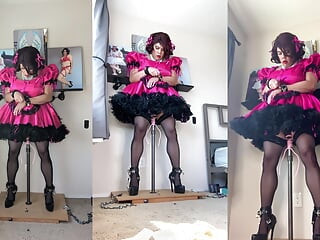 Candy si pembantu banci merah muda dikunci dengan dildo dan menunggangi tiangnya